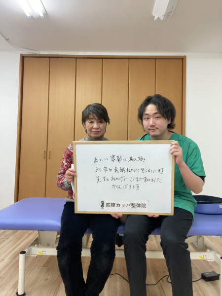 Q、あなたと同じような症状でお悩みの皆様へメッセージがありましたら教えてください。 A、何か症状に困ったらすぐにでも行きましょう!レッツゴー!私はカッパ整体院で腰痛と大腿部の痛みが良くなりました。先生も優しくて思いやりがありますよ!カッパ整体院大大好きです!!